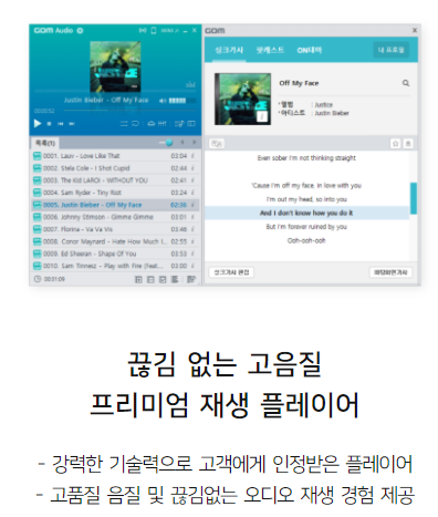 가사 싱크 기능: 곰오디오에서는 실시간으로 가사를 확인할 수 있으며, 자동으로 가사가 타이밍에 맞춰 표시됩니다.
