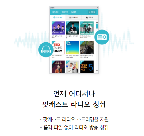 인터넷 라디오 및 팟캐스트: 곰오디오에서는 인터넷 라디오를 청취하거나 팟캐스트를 쉽게 관리할 수 있습니다.