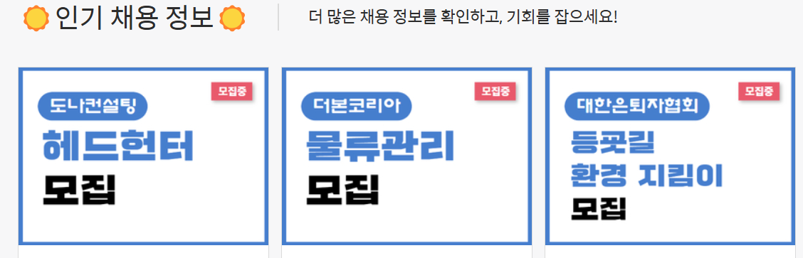 취업 정보 제공: 시니어에게 알맞은 취업 기회 제공 면접 코칭 및 구직 서류 작성 지원: 면접 준비와 구직 서류 작성에 대한 실질적인 도움 제공 교육 및 훈련 프로그램: 다양한 직무 관련 교육을 통해 구직자의 역량을 강화
