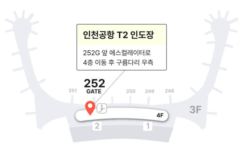 위치: 출국장 3층의 252번 게이트 앞에서 에스컬레이터를 타고 4층으로 올라가면 구름다리 건너 오른쪽에 위치해 있어요.