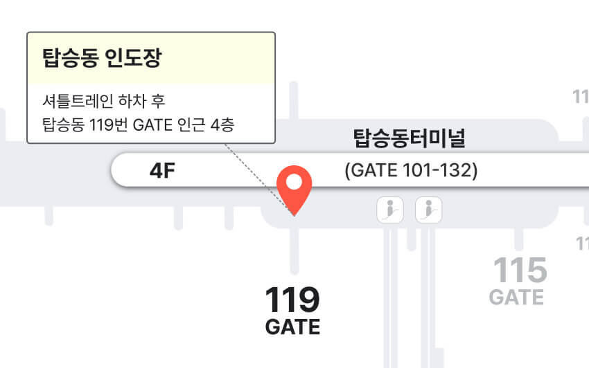 탑승동 인도장: 셔틀트레인 하차 후 4층 119번 게이트 근처