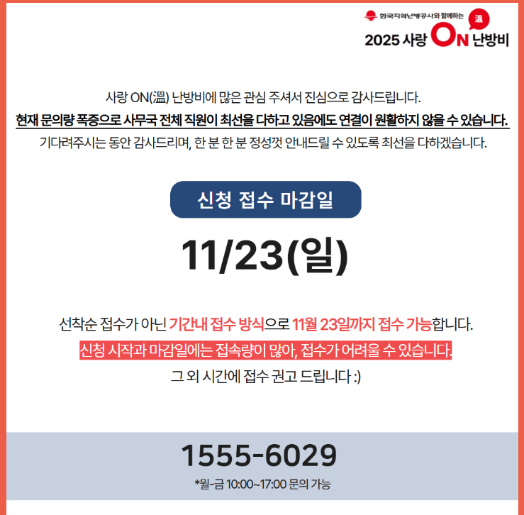 가능하면 11월 중순 이전에 사랑온난방비 신청을 끝내는 것을 강력 추천합니다.